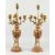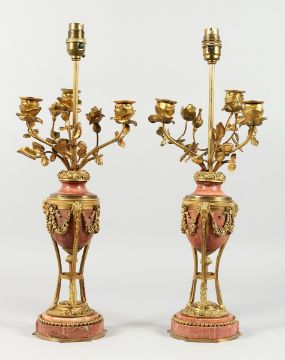 A VERY GOOD PAIR OF REGENCY, ORMOLU AND MARBLE URN SHAPED THREE BRANCH CANDELABRA, mounted with ram's masks and garlands.
