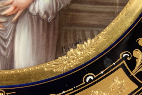 A GOOD VIENNA CIRCULAR COMPORT, blue and gilt border the centre painted with a portrait 'La Cruche Cassie.