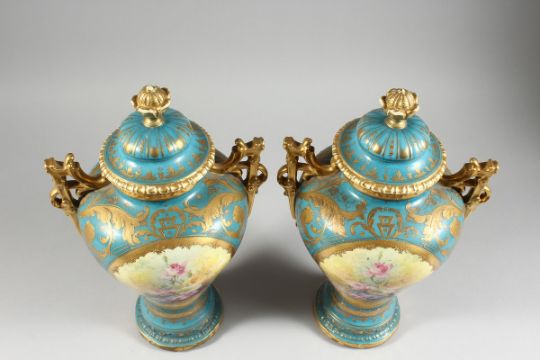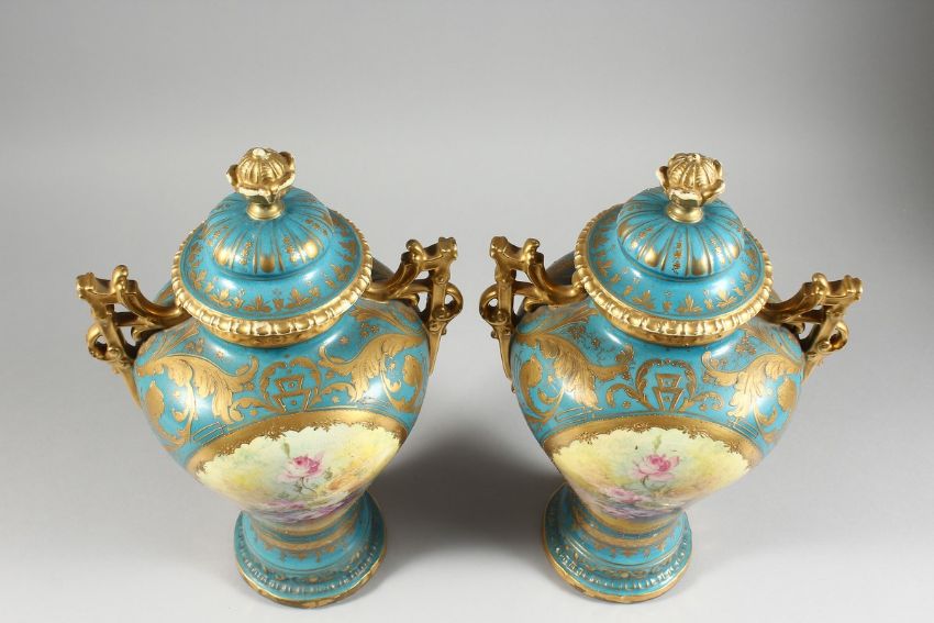A PAIR OF GERMAN BONN TWO HANDLED VASES with blue and gilt ground painted with reverse panels of flowers and lids. 13 in. high.