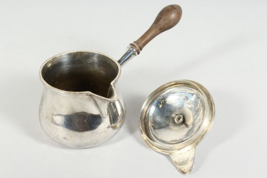 A GEORGE III SILVER BRANDY PAN and cover with wooden finial and handle. London 1812 & 1810, gross weight 14 oz.