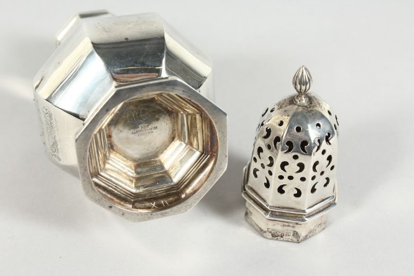 AN OCTAGONAL SILVER SUGAR CASTOR, 6.5 inches high, Birmingham 1930, weighs 4 ozs.