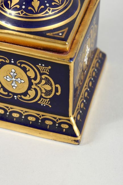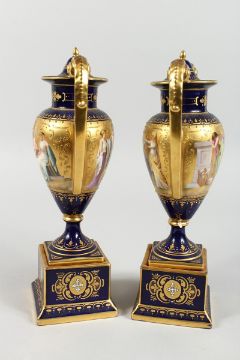 A SUPERB PAIR OF VIENNA TWO HANDLED VASES AND COVERS, rich blue and gilt grounds, painted with a band of classical figures.