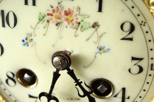 A GOOD LOUIS XVI GILT METAL AND SEVRES MANTLE CLOCK with Serves panels, cupids and flowers, the case with figures, scrolls and acanthus, the dial painted with garlands.