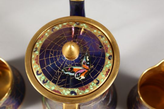 A CARLTON WARE BLUE BUTTERFLY COFFEE SET, comprising coffee pot and cover, sugar basin, milk jug, five cups and saucers