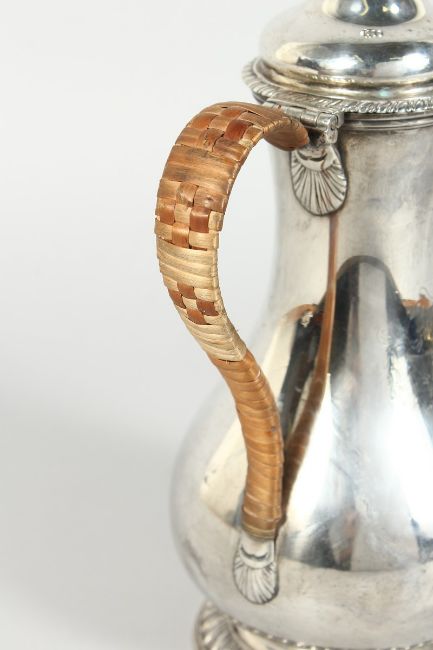 A GEORGE III SILVER PEAR SHAPED COFFEE POT and cover with a raffia handle and armorial crest, 10.5 inches high. London 1771, maker Phillip Norman, weight 20 ozs.