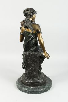 AFTER MOREAU, A TWO COLOURED BRONZE OF A CLASSICAL GIRL with winged cherub on a circular marble base.