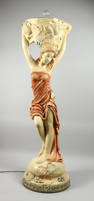 A COMPOSITION CREAM AND GILDED UPLIGHTER formed as a classical female figure holding a basket, 4 ft. 3 in. high.