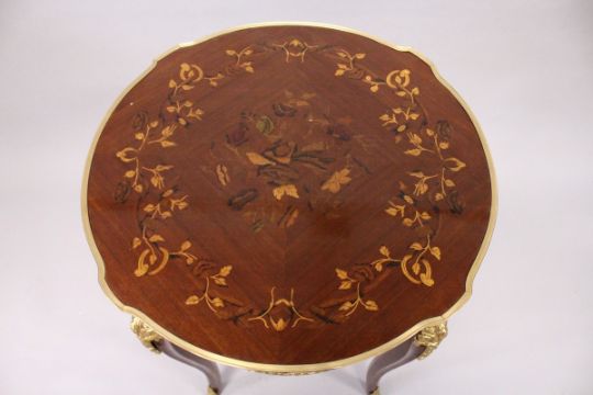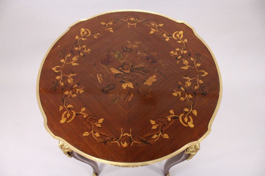 A FRENCH STLYE MAHOGANY AND ORMOLU MOUNTED MARQUETRY CENTRE TABLE, on cabriole legs