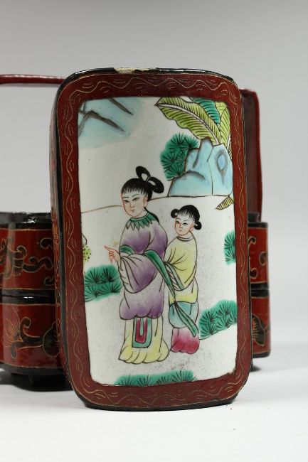 A CHINESE LACQUERED THREE TIERED BASKET.