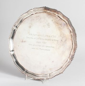 A PIE CRUST SILVER SALVER with gadrooned edge on four knurled feet presented to Sir Anthony Lewis, CBE. 12 inches diameter with inscription, London 1978, weight 28 ozs.