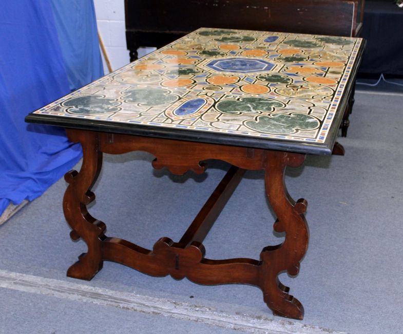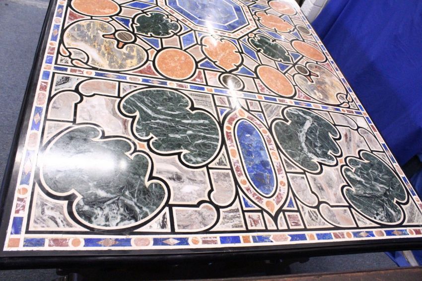 AN IMPRESSIVE 19TH/20TH CENTURY ITALIAN SPECIMEN MARBLE-TOPPED TABLE, inset with coloured stone. 7' 2" long x 3' 11" wide.