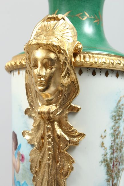 A GOOD PAIR OF SEVRES DESIGN TWO HANDLED VASE AND COVER