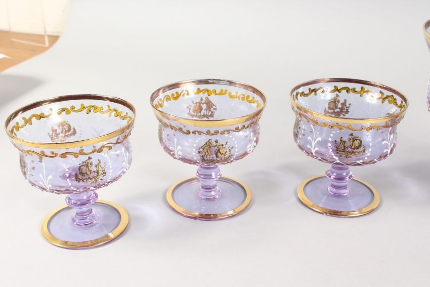 A GOOD CONTINENTAL NEODYMIUM GLASS ICE CREAM SET with gilt and enamel decoration, comprising pedestal bowl and six glasses. The glass peculiarly turns purple under bright light.