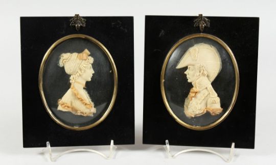 A PAIR OF REGENCY WAX PORTRAIT BUSTS, framed 4.5 ins x 3.75 ins