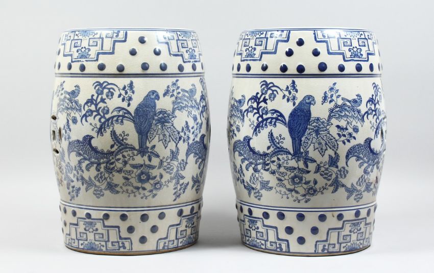 A PAIR OF CHINESE BLUE AND WHITE BARREL SEATS