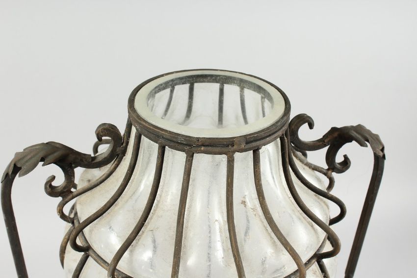 A FOUR TIER TINTED SHAPED GLASS VASE on a wrought iron stand, 13 ins diameter.