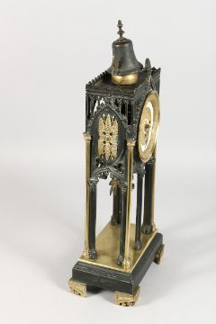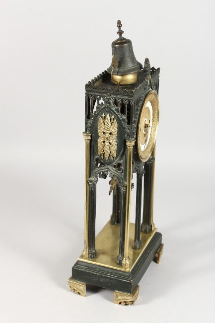 A GOOD 19TH CENTURY ARCHITECTURAL BRONZE GOTHIC DESIGN CLOCK, the movement with two dials 1-12 and a centre dial 1-31, striking on two bells with Gothic column supports on brass bracket feet.