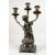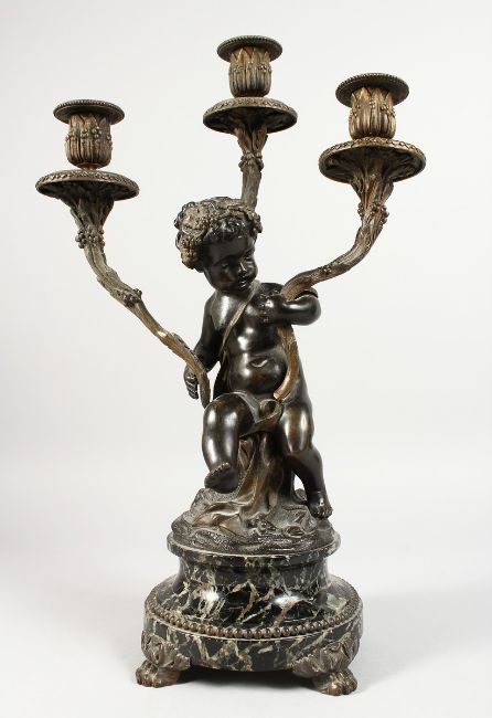 A GOOD 19TH CENTURY FRENCH BRONZE AND ORMOLU THREE BRANCH CANDELABRA formed as a cupid holding three scrolling branches, on a circular marble base.