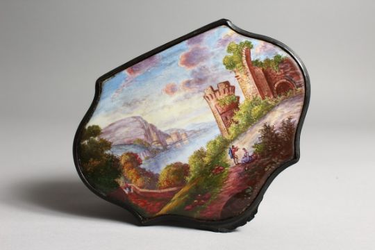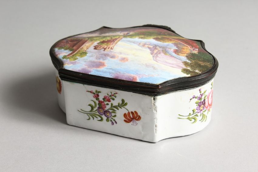 A LARGE ENAMEL BOX AND COVER the top painted with a lake, ruined castle and figure, the sides and inside lid with flowers.