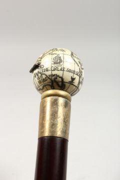 A CARVED BONE GLOBE HANDLE WALKING STICK