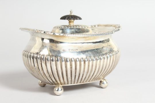 A VICTORIAN SEMI FLUTED TEA CADDY, with gadronned edge on ball feet, London 1894, maker Huttons , weighs 9ozs