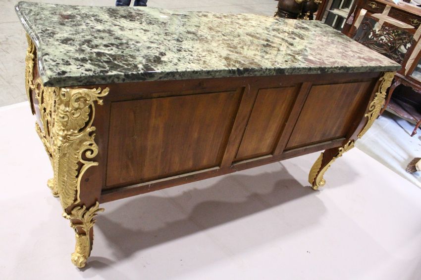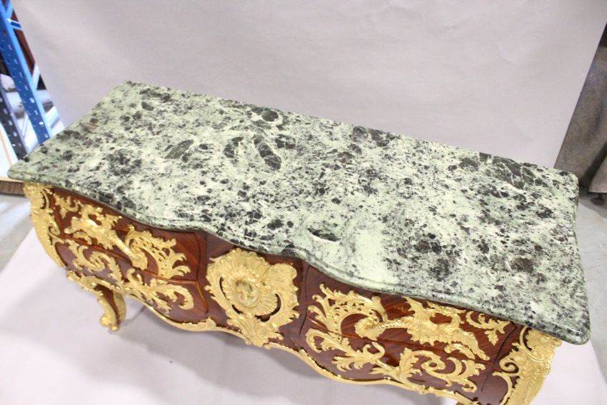 AN ENORMOUS LOUIS XVITH STYLE MARBLE TOPPED COMMODE with shaped grey marble top. The front smothered in ormolu with dragon and acanthus handles. Satyr mask on bold ormolu mounted curving legs.