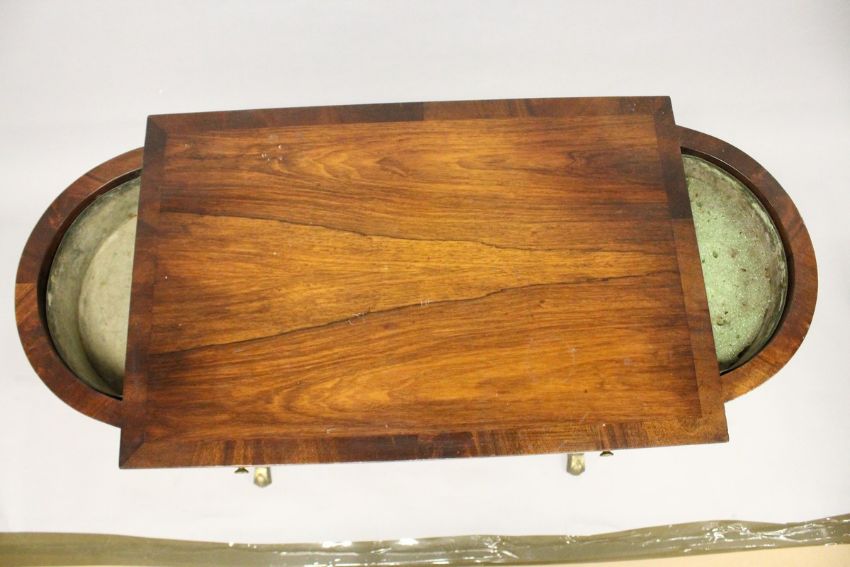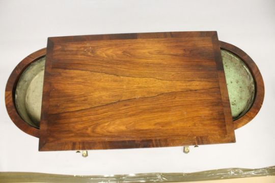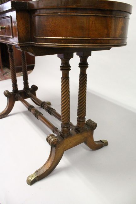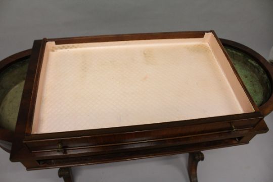 A REGENCY DESIGN MAHOGANY SIDE TABLE, with a single drawer, the bowed ends with zinc liners, supported on wrythen fluted columns with curving legs and brass casters.