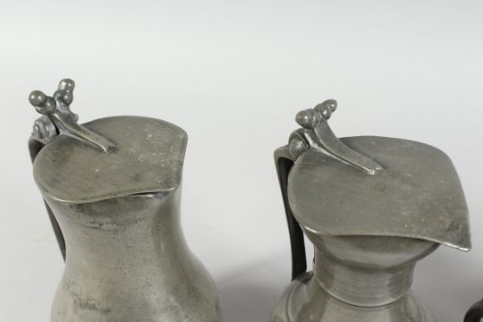 AN 18TH CENTURY FRENCH PEWTER TAPPIT HEN 7 ins high. A jug 7 ins high and two tankards (4).