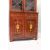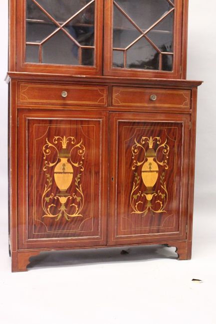 AN EDWARDIAN MAHOGANY STANDING BOOKCASE, the top with swan neck pediment, pair of glazed doors over a base with pair of marquetry inlaid doors, two drawers on bracket feet.