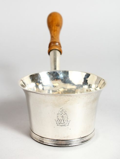 A QUEEN ANNE SILVER BRANDY POT, 3 is diameter, with turned wood handle