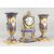 AN ITALIAN THREE PIECE CLOCK GARNITURE comprising blue and gilded clock, painted with flowers, 19 in. high and a matching pair of vases on square bases.
