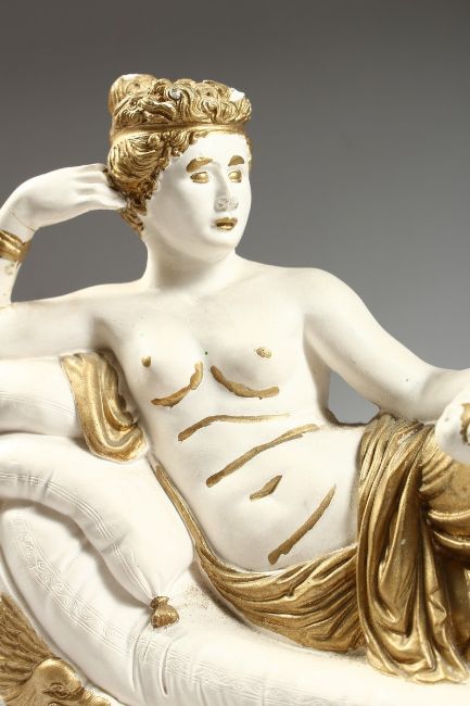 A POTTERY SEMI NUDE on a chaise longue, 15 ins. long
