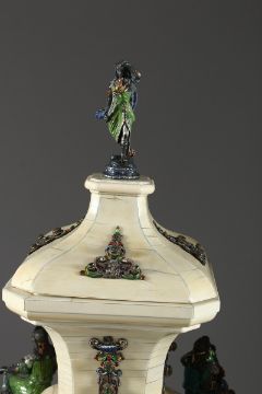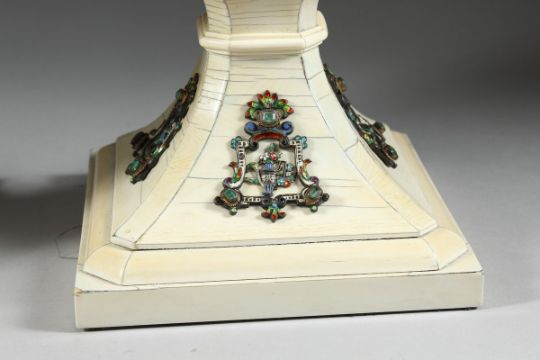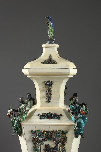 A SUPERB PAIR OF VIENNA IVORY TAPERING VASES AND COVERS, mounted silver and enamel plaques set with semi precious stones and figures.