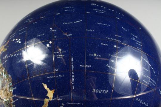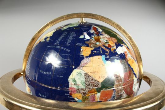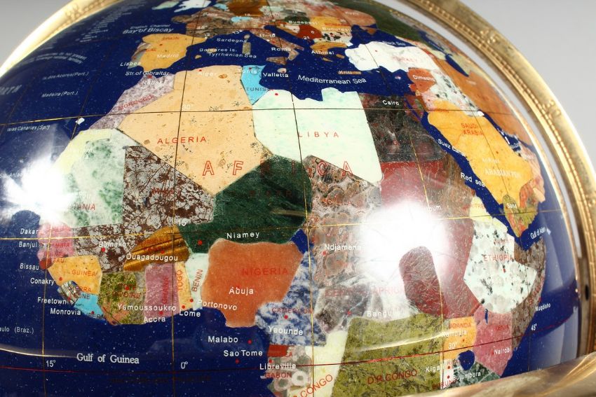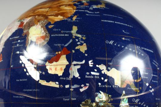 A HARDSTONE TERRESTRIAL GLOBE OF THE WORLD on a metal base. (AF)