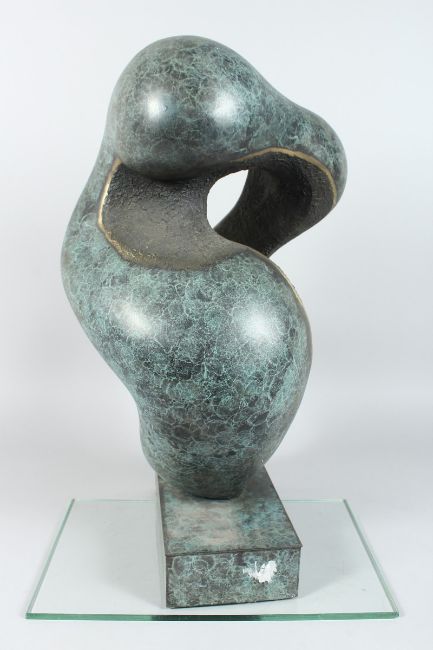 A LARGE ABSTRACT SPECKLED BRONZE ENTWINED FIGURE on a rectangular base,