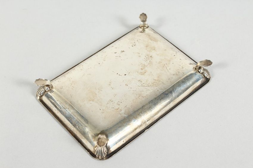 A PLAIN SILVER RECTANGULAR DISH on four claw feet, 4.25 oz, Birmingham 1961