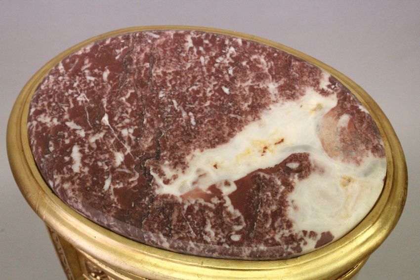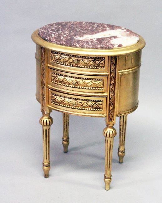 A FRENCH STYLE GILT WOOD THREE DRAWER OVAL CHEST, with red marble inset top.