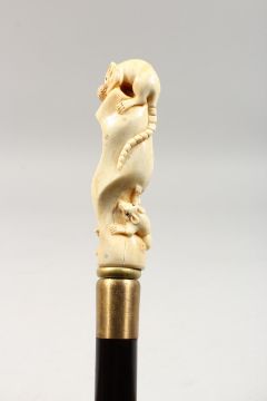 A CARVED BONE THREE RATS HANDLE WALKING STICK