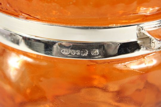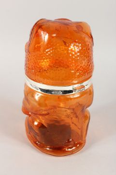 AN AMBER GLASS PUG BISCUIT BARREL