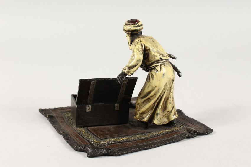 A GOOD AUSTRIAN PAINTED COLD CAST GROUP, an Arab opening a box of swords on a carpet.