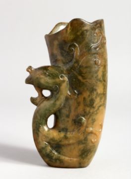 A STIRRUP CUP CARVED WITH A PHOENIX HANDLE, 5 ins high