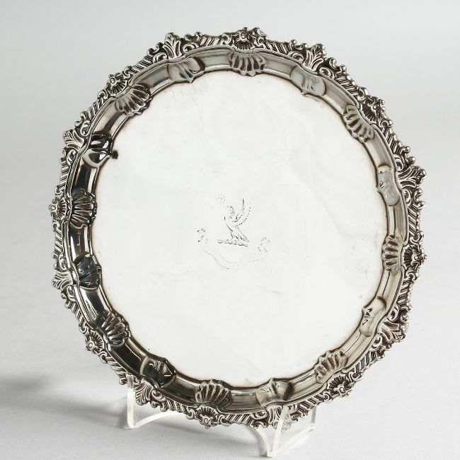 A VICTORIAN SILVER PIE CRUST SALVER, crested on three claw and ball feet