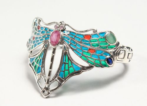 A SILVER RUBY EMERALD SAPPHIRE AND ENAMEL DRAGONFLY BANGLE