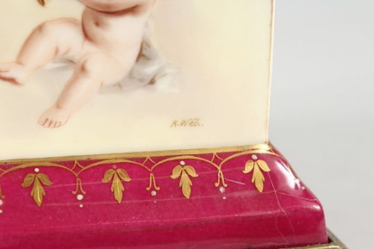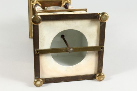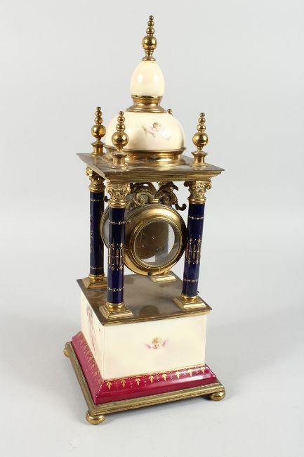 A SUPERB VIENNA PORCELAIN AND GILT METAL PILLAR CLOCK painted with cupids with blue and gilt