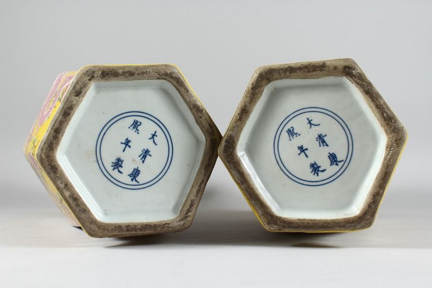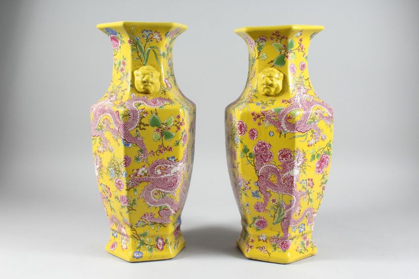 A PAIR OF YELLOW DRAGON DESIGN OCTAGONAL VASES