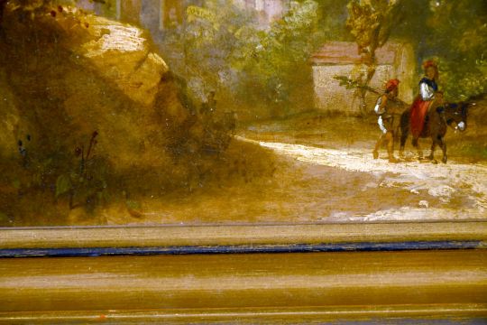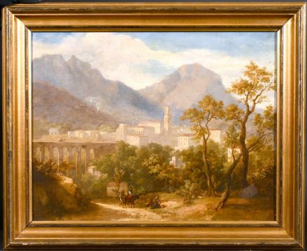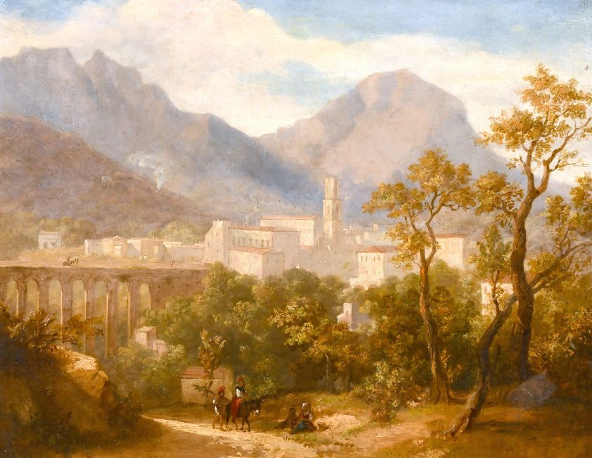 19th century continental school, Wayfarers resting by a pathway with a town and viaduct in the distance, oil on canvas, 14.75" x 18.5".
