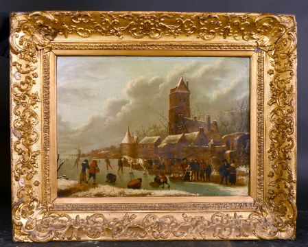 17th Century Dutch school, Figures on a frozen waterway with town buildings and a windmill beyond, oil on panel, 13.5" x 18.75".