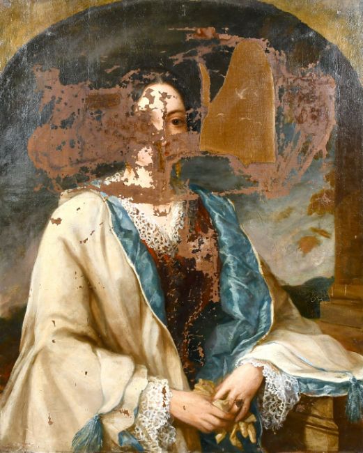 19th century French school, A portrait of a lady, oil on canvas, 36" x 28.5", (A/F).