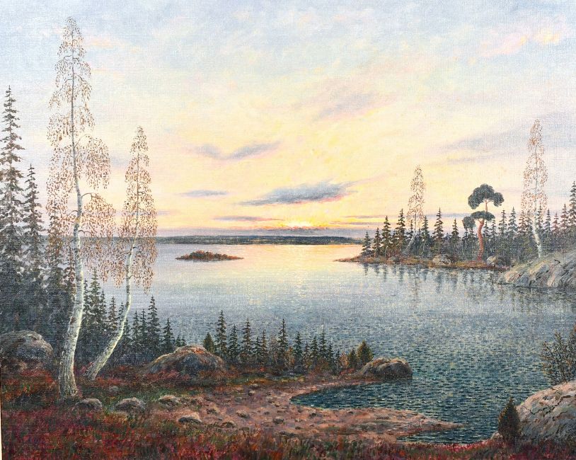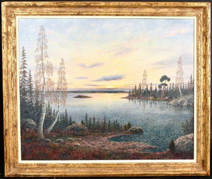 20th century 'Lake Dalrymple, Canada', A lake view at sunset, oil on canvas, indistinctly signed, 26" x 32".
