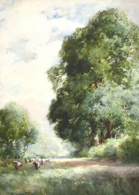 Charles Harrington (1865-1943) British, Cattle grazing in woodland shade, watercolour, signed, 14" x 10".